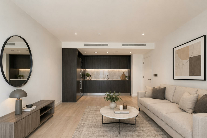 The apartment features a spacious open-plan reception and kitchen with floor-to-ceiling windows, flooding the space with natural light, alongside sleek finishes and integrated appliances.